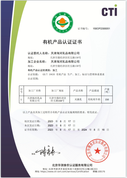 海河乳品公司成功獲得 “有機產(chǎn)品認證”